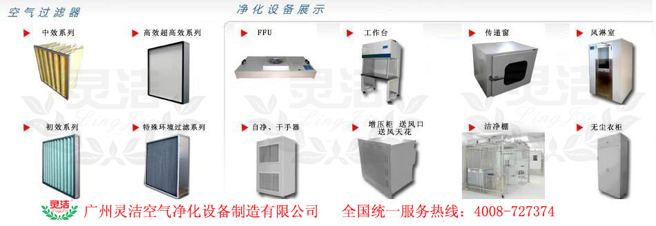 空氣過濾器、空氣凈化設備專業廠家,通過ISO9001、ISO14001、CE、ROSH等多項國際認證,100%品質保證!“靈潔”牌空氣過濾器及凈化設備產品均按國家標準全檢合格出廠,廠家長期提供技術支持, 歡迎來電咨詢!專業生產“靈潔”牌G級初效過濾器,F級中效過濾器,H級高效過濾器,U級超高效過濾器及各類液槽式過濾器、耐高溫過濾器、化學過濾器、PM2.5過濾器、HEPA濾網等;專業生產“靈潔”牌風淋室、傳遞窗、超凈工作臺、FFU(風機過濾單元)、層流送風天花、百級層流罩、DOP高效送風口、潔凈棚、新風柜、生物安全柜等 聯系人 : 劉小姐 18925063248 龔先生 13710142110